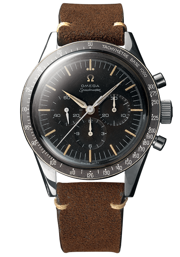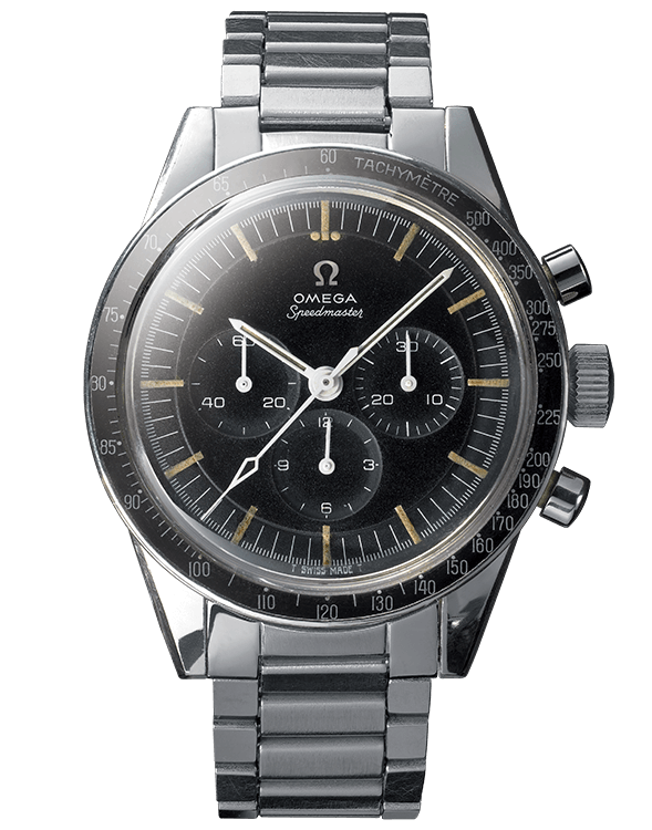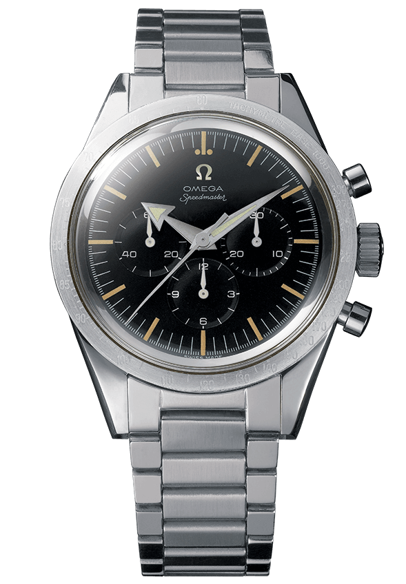 スピードマスター=宇宙というイメージが確立されているせいか、この腕時計のヒストリーをよく知らない人は、スピードマスターが宇宙探索のために開発されたと誤解されていることが多い。実際はまったくそんなことはなく、スピードマスターはレーシングドライバーのために作られたモデルである。ダイヤルではなく外周ベゼルにタキメーターを表示した世界で初めての時計であり、その画期的なデザインと視認性の良さは当時のレーサーたちから歓迎された。